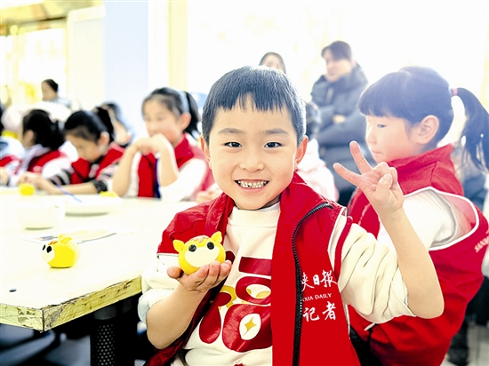 1月11日,三门峡日报小记者走进心雨面艺坊花馍店,体验花馍面点制作,感受传统工艺的魅力。图为小记者展示捏好的花馍。 南飞燕 摄