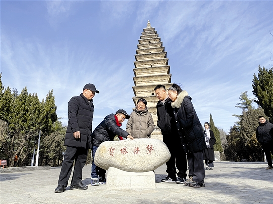 随着“白天鹅旅游季”的持续升温,我市各大景区游客数量显著增长,图为1月10日,游客在陕州公园宝轮寺苑内感受回音建筑宝轮寺塔的魅力。 杜朝霞 摄
