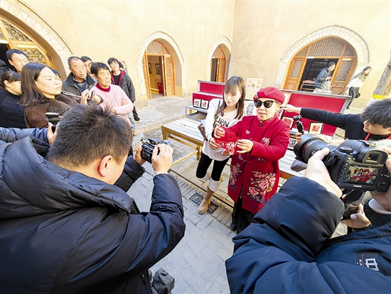 1月15日,为期两天的三门峡市第三届电商短视频和直播大赛在陕州区火热开赛。来自全市的9支代表队25名选手深入高阳山温泉国际度假区领略康养魅力、探访陕州地坑院感受民俗风情、走进河南龙陕山果贡天下农业有限公司挖掘农产亮点,用短视频形式展现三门峡特色风貌。图为参赛选手在陕州地坑院拍摄陕州剪纸。 本报记者 王建栋 摄