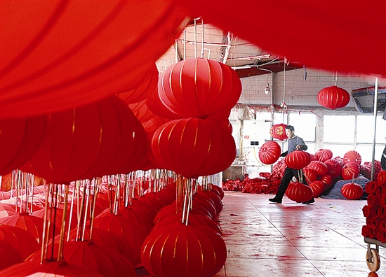 1月15日,工人在石家庄市藁城区屯头村一家宫灯厂制作宫灯。