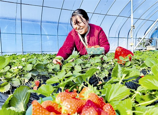 上图:1月14日,灵宝市川口镇三圣村草莓种植园里,村民赵艳丽在忙着采摘。临近春节,草莓迎来销售旺季。 杨蓓蓓 摄