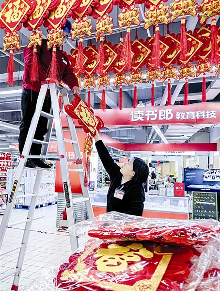 下图:1月13日,渑池县盛德美超市的员工正在悬挂、张贴各种精美挂件。春节将至,我市消费市场持续升温,节日氛围越来越浓。 王家臣 摄