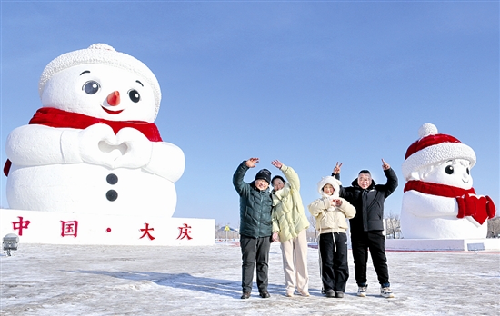 1月16日,游客在黑龙江大庆市一处大雪人景观前拍照。