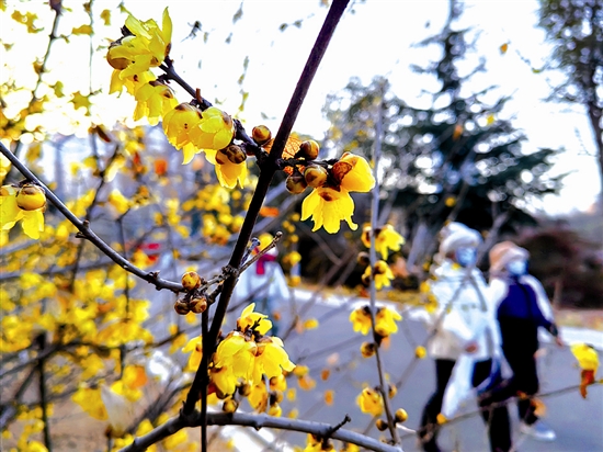 日前,陕州区甘棠公园遗爱湖畔,上百棵蜡梅于寒风中傲然绽放。嫩黄花朵在枝头摇曳,暗香浮动,不畏严寒的姿态,为冬日增添一抹亮色与生机。 张兵波 摄