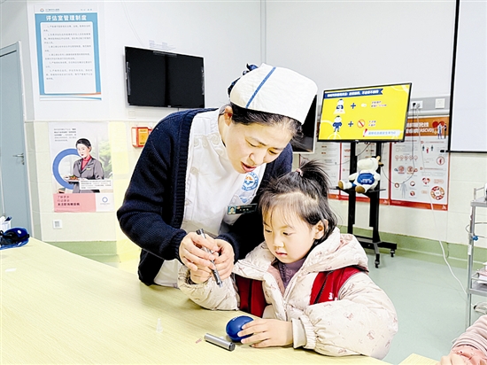 活动中,王万民还为大家深入浅出地科普了过量摄入糖分对成人和儿童健康的潜在危害。随后,内分泌科护士长卜春霞通过趣味互动,手把手指导小记者模拟操作胰岛素笔,在实践中学习健康知识。