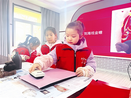 1月18日,三门峡日报小记者走进市博物馆,通过动手拓印木版年画,感受传统年味。图为小记者体验木版拓印。 胡喆喆 摄