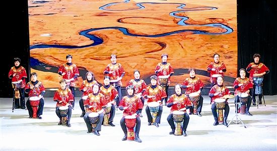 近日,由渑池县文化馆举办的“艺韵渑池·共展风采”演出在该县融媒体中心精彩上演。来自全县19个民间文艺团队以合唱、舞蹈、器乐等丰富多彩的节目为群众送上一场“文艺大餐”。图为仰韶开心鼓乐队表演非洲鼓。 王家臣 摄