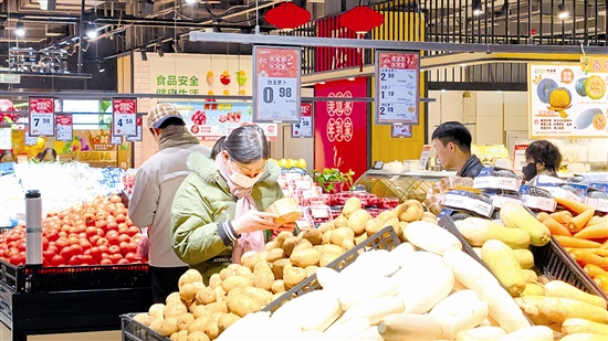 1月19日,我市迎来降雪及强降温天气,全市生活必需品供应稳定。各类蔬菜、水果、肉类等生活物资库存充足、价格平稳,充分满足市民日常采购需求。图为1月20日,市民在三门峡市区和平路美道家超市内选购新鲜蔬菜。 尚栋 摄