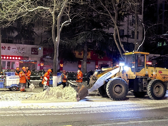 1月20日夜,义马市区千秋路上,环卫工人配合机械清理路旁积雪。