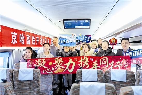 1月22日,全长1198公里的京哈高铁迎来全线开通运营五周年。在哈尔滨西开往北京朝阳的G902次动车组列车上,中国铁路哈尔滨局集团有限公司开展相关文旅互动活动。京哈高铁全线开通运营五年以来,中国铁路哈尔滨局集团有限公司累计运送京哈间旅客3936万人次。