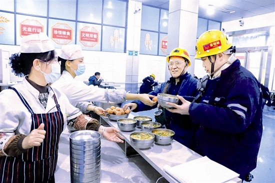 1月26日是腊八节,河南大有能源义煤集团常村煤矿工会联合后勤中心开展“腊八有温度 ‘粥’到保平安”主题活动,以传统节日为契机强化职工安全意识,为一线职工送上节日祝福、冬日温暖与安全嘱托。图为该矿井口食堂内工作人员正将盛好的甜、咸腊八粥和鸡蛋送到就餐职工手中。 吴美莲 摄
