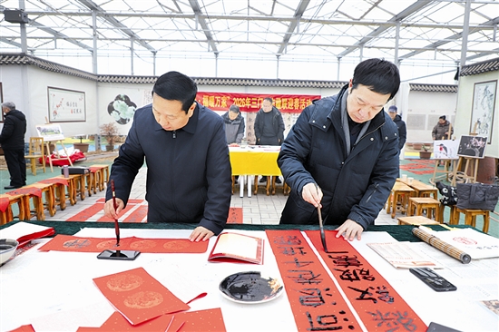 1月29日,市城乡一体化示范区(高新区)禹王路街道马谢村黄河梅园,来自市楹联学会书画院的书法爱好者在为群众义写春联。当天上午,“骐骥联春·福暖万家”2026年楹联迎春活动走进示范区(高新区),在近3个小时时间里,6位书法爱好者冒着严寒为群众义写春联200余副。 本报记者 徐洪波 摄