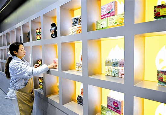 1月27日,在河南濮阳县的中国(濮阳)埃塞咖啡产业示范园咖啡展销区,工作人员在整理产品。