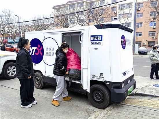 日前,陕州区神泉苑小区门口的快递服务点迎来了一辆无人驾驶快递车,工作人员正有序卸下包裹。这辆由圆通速递与新石器合作的X6-S无人车,让居民取件更便捷,标志着智慧物流正悄然走进百姓的日常生活。 张兵波 摄