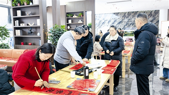 2月1日,“骐骥联春·福暖万家”2026年三门峡市楹联迎春活动走进瑞德·学府尚品售楼部,市楹联学会书法艺术家现场为市民义写春联,传递新春祝福。 尚栋 摄