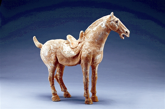 另一匹唐代彩绘陶马(公元618—907年)则气度迥然。它四足稳立,昂首向天作嘶鸣状,短尾上扬,全身筋肉饱满,充满刚健张力。通体白衣与鞍上赭红彩绘,虽历经千年有所脱落,仍难掩其当初的华彩。这匹唐马,不再服务于具体的战争或礼制,其昂扬自信、生命勃发的姿态,正是那个开放强盛、意气风发的伟大时代精神的缩影。