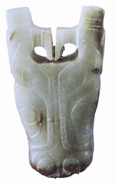 在宏大的车马阵仗之外,一件虢国出土的马首形玉佩格外引人注目。这块带褐红斑的青玉,以圆雕技法琢出昂扬竖耳、有神的臣字眼,鼻孔处C形卷云纹精巧别致,下端斜穿孔兼顾佩挂实用功能。这块高仅5.8厘米的玉珮,虽盈手可握,却将马的矫健与灵动凝于指尖。