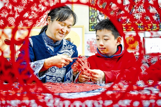 2月3日,在贵州省贵阳市省府路小学,学生在老师的指导下创作马年主题剪纸作品。