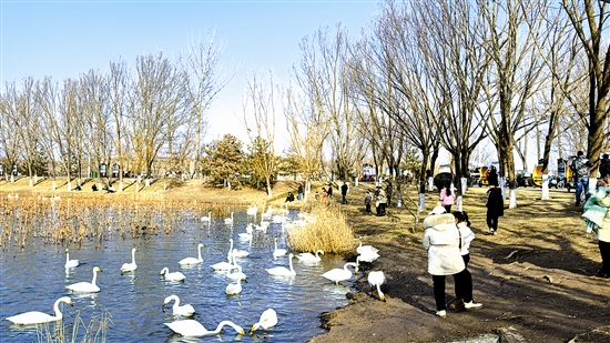 2月2日,在三门峡黄河公园芦荡烟雨湖畔,白羽天鹅游弋清波,市民游客静赏美景,人与自然相融共生,勾勒出一幅动人的冬日生态画卷。 尚栋 摄