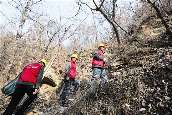 2月1日,在卢氏县五里川镇雷家坪村,电力工人进行巡线,确保群众冬季安全平稳用电。