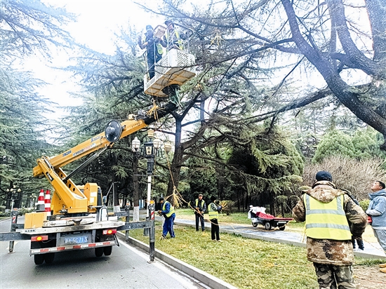 连日来,三门峡经济开发区工作人员在陕州公园道路两侧行道树悬挂彩灯,扮靓街区,营造出喜庆祥和的新春氛围。 本报记者 张明 摄