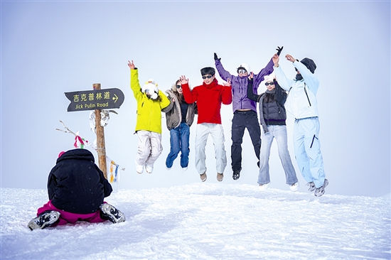 2月4日,滑雪爱好者在新疆阿勒泰地区禾木吉克普林国际滑雪度假区拍照留念。