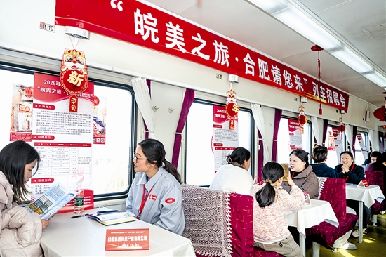 当日,由中国铁路上海局集团有限公司合肥客运段联合合肥市人力资源和社会保障局举办的列车招聘会在上海站开往阜阳站的K8362次列车上举行,为返乡游子架起就业对接的桥梁。 新华社记者 杜宇 摄