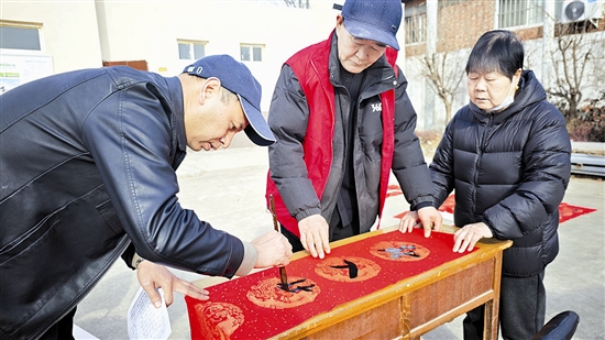 2月5日,2026年“骐骥联春·福暖万家”出彩渑池楹联迎春暨渑池县第九届百名书法家义写春联活动走进天池镇笃忠村,渑池县文联组织20多位书法家为村民免费书写春联800余副,受到村民们欢迎。 本报记者 王超 摄