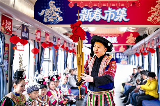 2月8日,演员在5640次“慢火车”上吹奏芦笙。