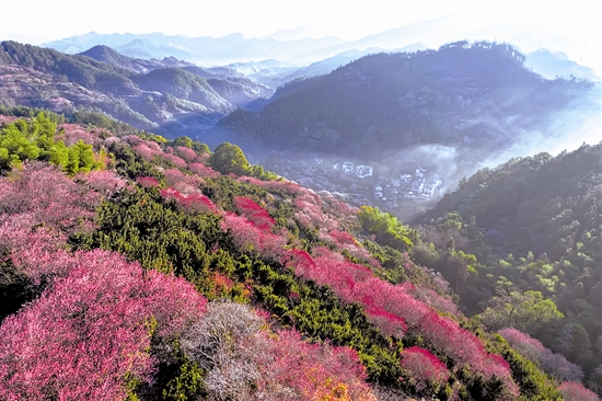 近日,在安徽省黄山市歙县雄村镇卖花渔村,漫山遍野的梅花绽放,花海与徽派村落民居相映成趣,景美如画。 新华社发