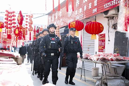 春节临近,三门峡市公安局特巡警支队民警走上街头、深入市场,开展巡逻防控,为节日安全保驾护航。图为该支队民警在市区宏远市场进行巡逻。 本报记者 刘晨宁 摄