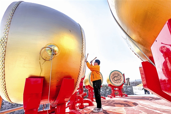 2月11日,一位来自天津的游客在函谷关历史文化旅游区城墙上击鼓祈福。临近春节,函谷关景区装点一新,迎接八方宾朋来景区过大年。 杜杰 摄