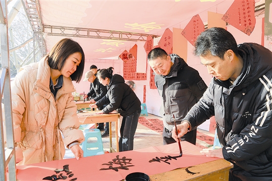 连日来,陕州小学师生在区教体局门前开展义写春联助学活动。活动现场,师生挥毫泼墨,为群众书写春联、“福”字,募集善款1000余元。据悉,该项活动已连续举办3年,所得善款全部用于资助困难学生。图为2月12日,义写春联活动现场。本报记者 王建栋 摄