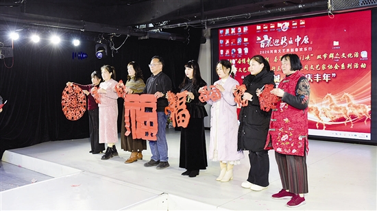 2月8日晚,“百花迎新乐中原”三门峡市民间文艺家协会“春归天鹅城 瑞雪庆丰年”迎春晚会举行。这场晚会以“传承与创新”为主线,突出民间文艺特色,多个非遗节目精彩亮相。特别是贺丽丽、兀静、王春晓等联手现场创作的“百福”剪纸作品,以指尖技艺传递美好祝福,受到热烈欢迎。 本报记者 李博 摄
