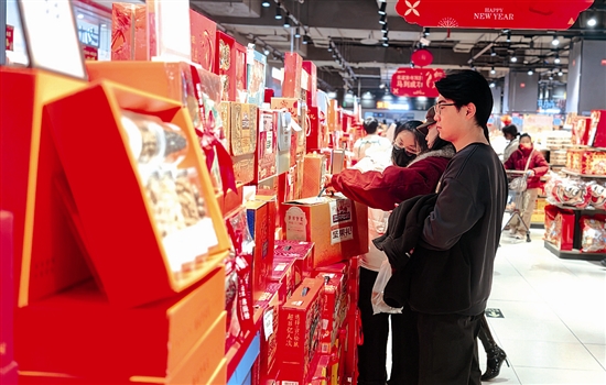 近日,市民在万达广场美道家超市选购年货礼盒。春节假期,各大商超人气旺盛,年货礼盒、生鲜食材等商品备受青睐。丰富的促销活动与充足的商品供应,点燃市民消费热情,节日市场活力十足。 尚栋 摄