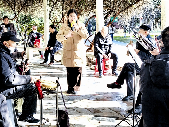 2月24日,天气晴好。三门峡虢国公园内一处廊道上,一位戏曲爱好者在戏班的伴奏下唱戏,悠扬的唱腔伴着春日的暖阳,吸引了众多市民驻足欣赏。 本报记者 胡晓萍 摄