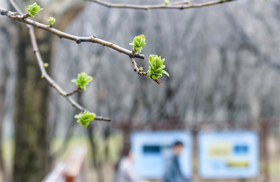 2月26日,三门峡天鹅湖国家城市湿地公园内,一场春雨过后,木瓜海棠嫩芽吐绿,尽显春日生机。 本报记者 孙猛 摄