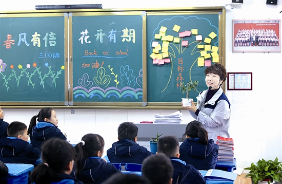 3月5日,三门峡市阳光小学的课堂上,老师正在为学生讲解植物生长习性,引导学生认识自然、融入春光、培养热爱大自然的美好情感。