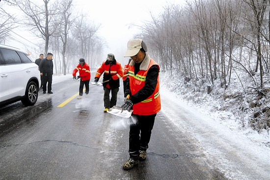 3月7日,受天气影响,S244线雁翎关村段出现道路结冰现象,车辆暂缓通行。陕州区公路部门第一时间赶赴现场,开展撒盐除冰作业,全力保障道路安全畅通。 本报记者 王建栋 摄