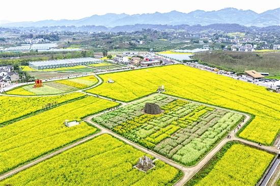 这是3月9日在重庆市璧山区七塘镇将军村莲花穴拍摄的油菜花田(无人机照片)。近日,重庆市璧山区七塘镇将军村莲花穴的油菜花田进入盛花期,吸引大批游客前来踏青打卡。