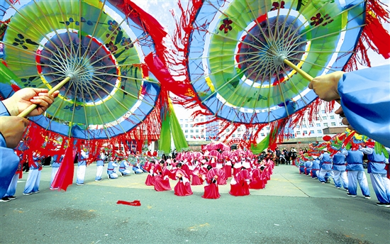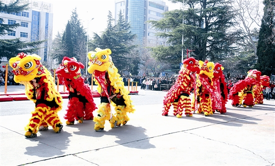 3月3日,“桃林骏马踏新程”元宵节社火表演在灵宝市金城大道精彩上演。该市万余群众共同观看了社火表演,图为社火现场精彩镜头。 本报记者 何英杰 摄