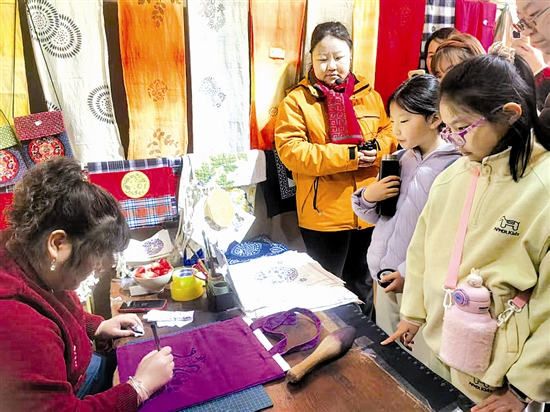近年来,牛天艺利用网络、展览及研学等方式积极传播捶草印花技艺,让更多人了解这项古老的工艺。她的身影频繁出现在小学、大学、社区和暑期课堂上,带着孩子们采野草、做手工,用最简单的方式让他们感受非遗的魅力。