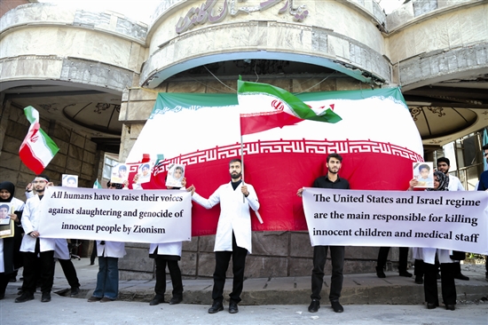 3月7日,伊朗医疗界人士在甘地医院集会,强烈抗议美国和以色列对伊朗医院等机构的袭击。甘地医院在美国和以色列1日发动的空袭中被击中。 新华社记者 沙达提 摄