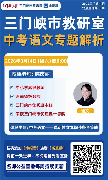 公益直播课每周一期,将针对中考各科重难点进行答疑解惑。各位老师、家长、学生可识别左下方二维码加“2026三门峡中招君”为好友,进群听课。本周六晚8:00,不见不散。 (本报记者)