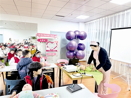 为弘扬孝母感恩的良好道德风尚,3月7日,三门峡日报小记者走进三门峡市中心医院产科,开展了一场别开生面的“生命教育”之旅,与母亲一起度过一个难忘的“三八”国际劳动妇女节,让小记者对生命有了更深刻的认识,也让大家体会到母亲的辛苦与不易。图为产科护士长邵丽为小记者讲解如何给“婴儿”整理包被。 程倩 摄