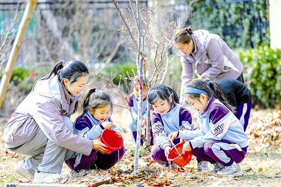3月11日,山东省青岛市李沧区青山路幼儿园的小朋友和老师一起给刚栽种的树苗浇水。
