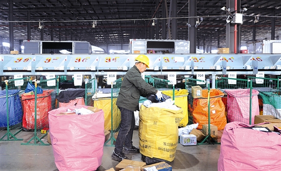 图⑩:3月5日,工作人员在三门峡铁路物流园分拣包裹。
