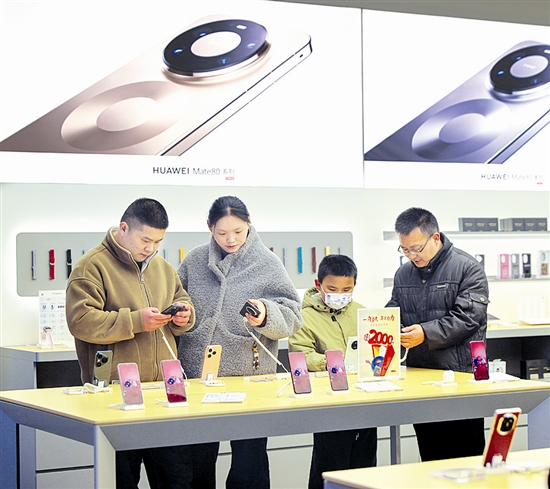 图⑧:3月2日,消费者在三门峡梦之城购物中心选购手机。