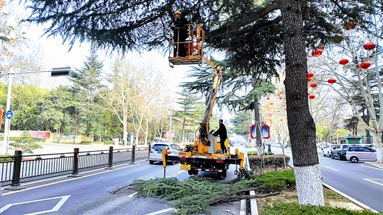 3月9日,三门峡市园林绿化服务中心在市区崤山路开展雪松抬杆修剪专项作业。工作人员沿道路规范实施整形修剪,清理枝条,消除公交通行与视线遮挡问题,优化道路绿化景观效果,保障市容整洁与市民出行安全。 本报记者 梁如意 摄