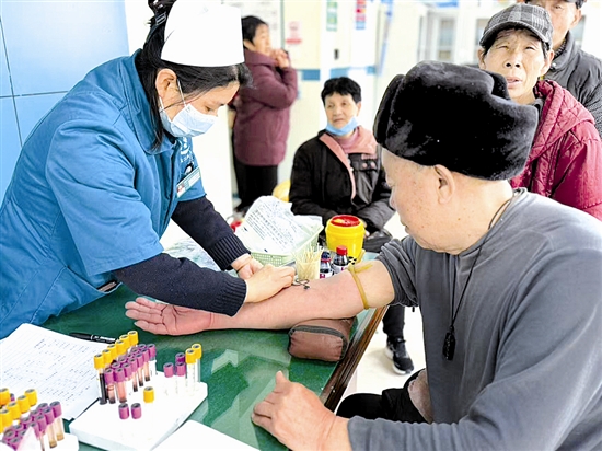 为进一步提升基层医疗服务质量,守护辖区群众身体健康,近日,湖滨区车站街道第二社区卫生服务站组织开展居民健康义务体检活动,为群众提供血压、血糖、血常规、心电图等多项检查,并进行健康指导,完善健康档案,用贴心服务守护居民健康。图为医护人员为群众抽血。 徐洪波 李东 摄